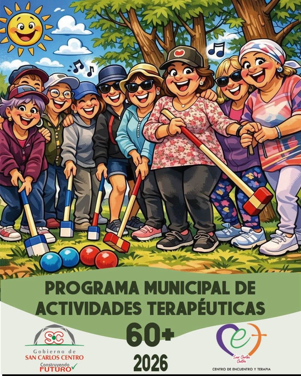 El GOBIERNO DE SAN CARLOS CENTRO invita a participar de una nueva edición del PROGRAMA MUNICIPAL DE ACTIVIDADES TERAPÉUTICAS “60 MÁS”, el dinámico sistema de talleres y actividades diarias destinado a nuestros adultos mayores que se llevará a cabo nuevamente en el Complejo del CET, con acceso totalmente libre y gratuito, cuyo objetivo es la atención integral, especializada y multidisciplinaria para continuar mejorando la calidad de vida y promoviendo la vejez activa y saludable.