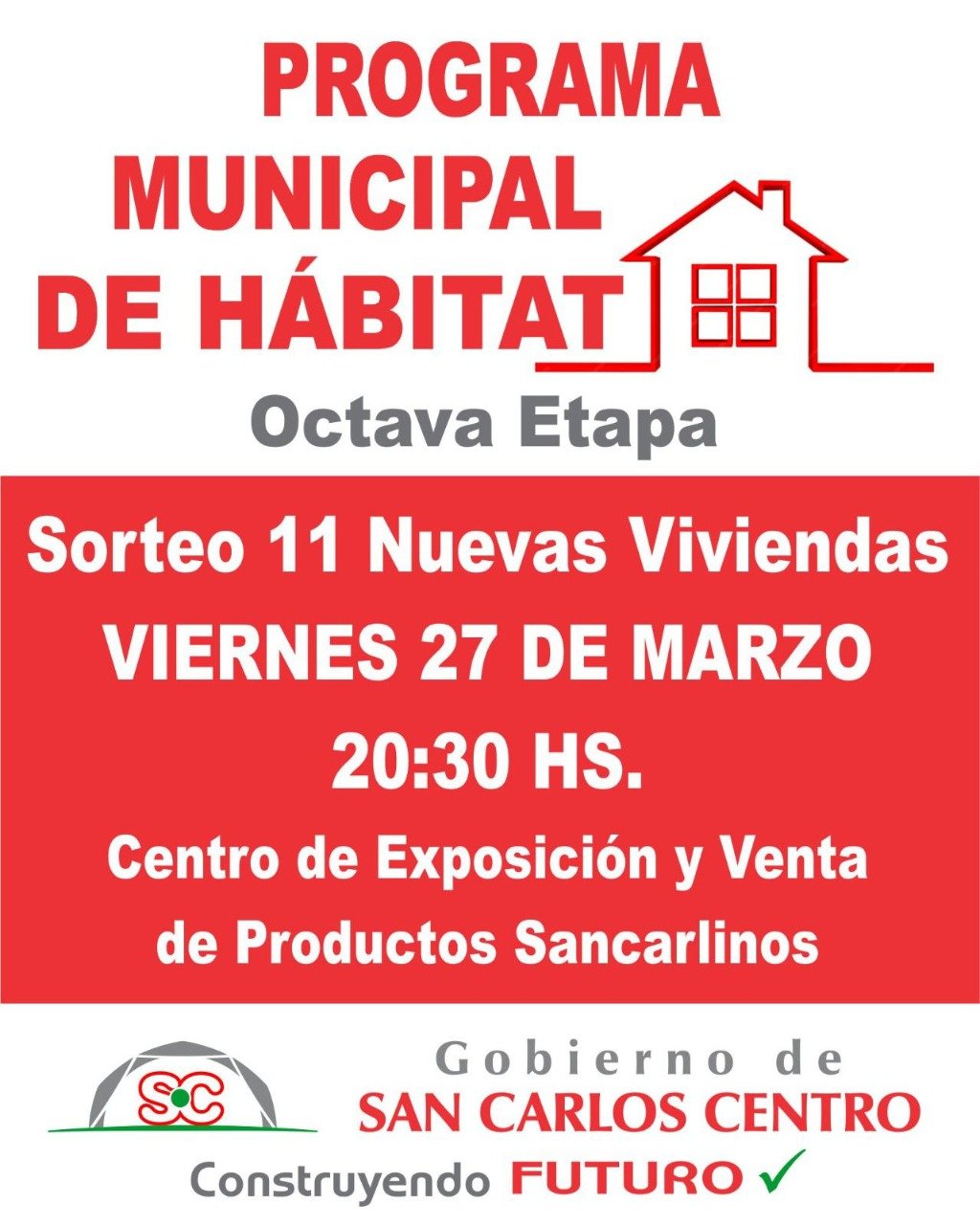 La firme decisión del GOBIERNO DE SAN CARLOS CENTRO de llevar adelante acciones concretas, que, sostenidas en el tiempo como política de estado, permitan ir paliando el déficit habitacional de nuestra ciudad, ha determinado el destino de fondos propios del Municipio para la concreción del Programa Municipal de Hábitat, el cual tiene como objetivo primordial facilitar el acceso de beneficiarios a terrenos y viviendas.