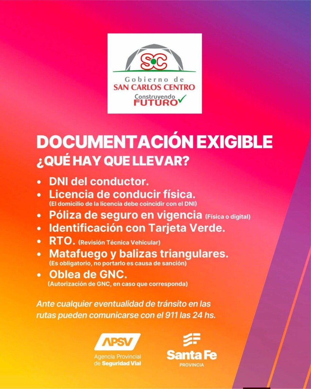 El GOBIERNO DE SAN CARLOS CENTRO, a través del Circuito de Educación y Seguridad Vial y Centro de Emisión de Licencias de Conducir, junto a la Agencia Provincial de Seguridad Vial, brinda algunas recomendaciones para considerar antes de salir a la ruta: