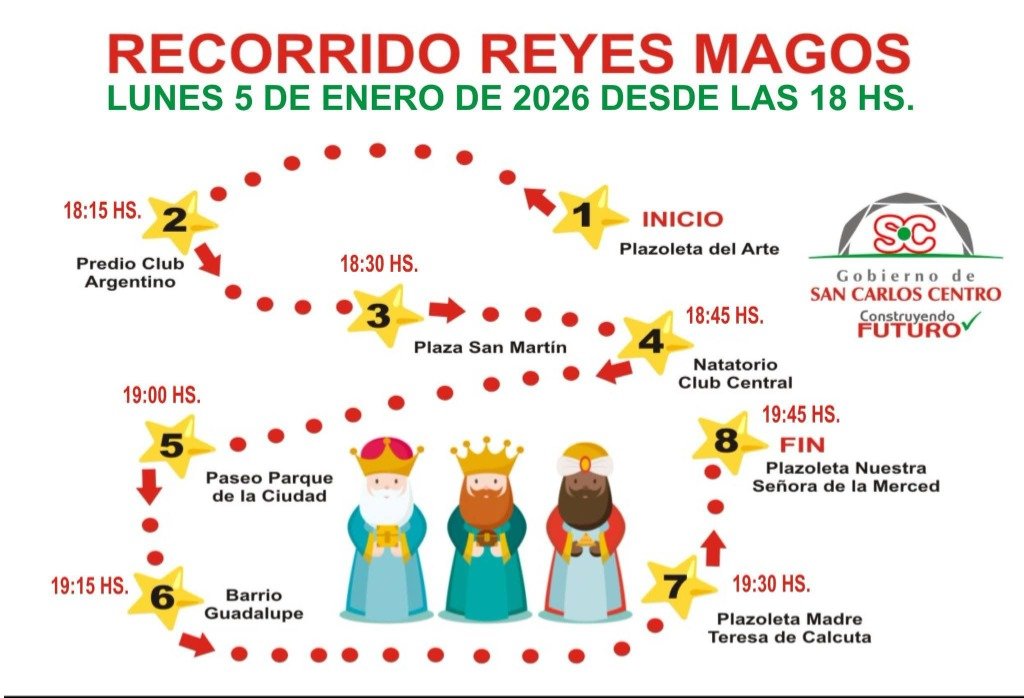 El GOBIERNO DE SAN CARLOS CENTRO invita a la comunidad a recibir a los REYES MAGOS que recorrerán las calles y espacios públicos de la ciudad, el LUNES 5 DE ENERO a partir de las 18 hs.