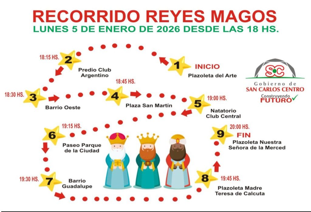 El GOBIERNO DE SAN CARLOS CENTRO invita a la comunidad a recibir a los REYES MAGOS que recorrerán las calles y espacios públicos de la ciudad, HOY LUNES 5 DE ENERO a partir de las 18 hs.